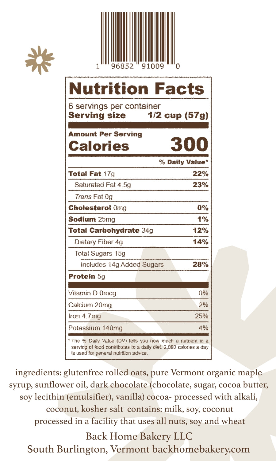 A simple yet tasty treat. Not too sweet with just hints of chocolate, coconut and maple. Best on yogurt, ice cream or just as a cereal with milk.